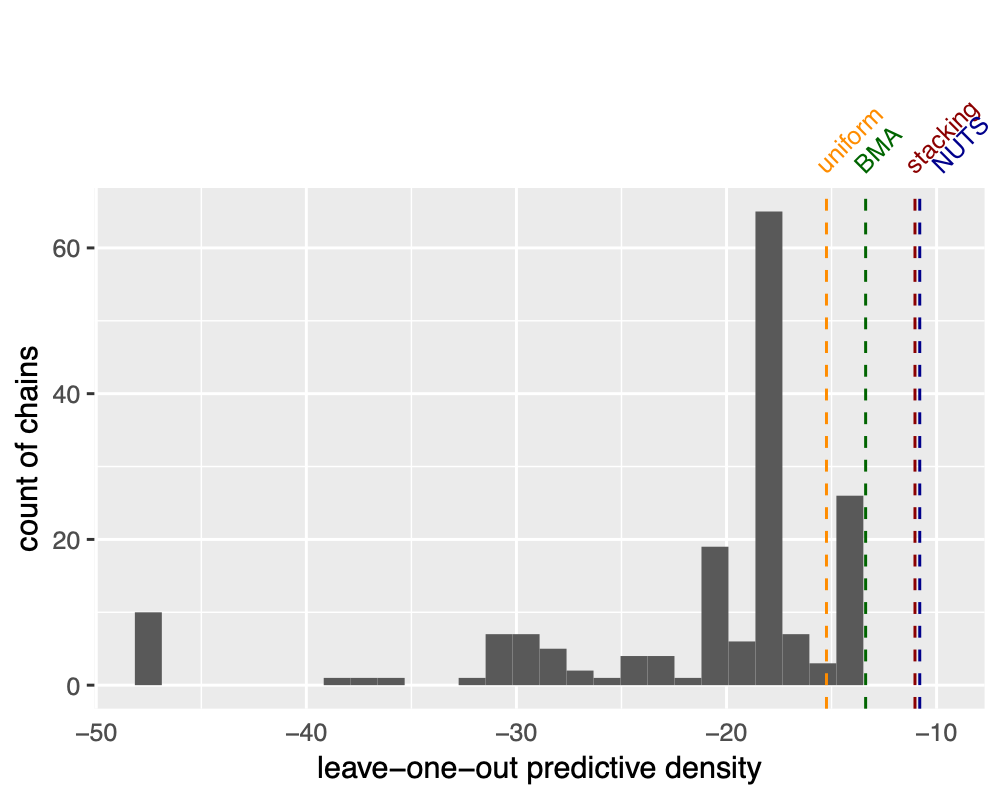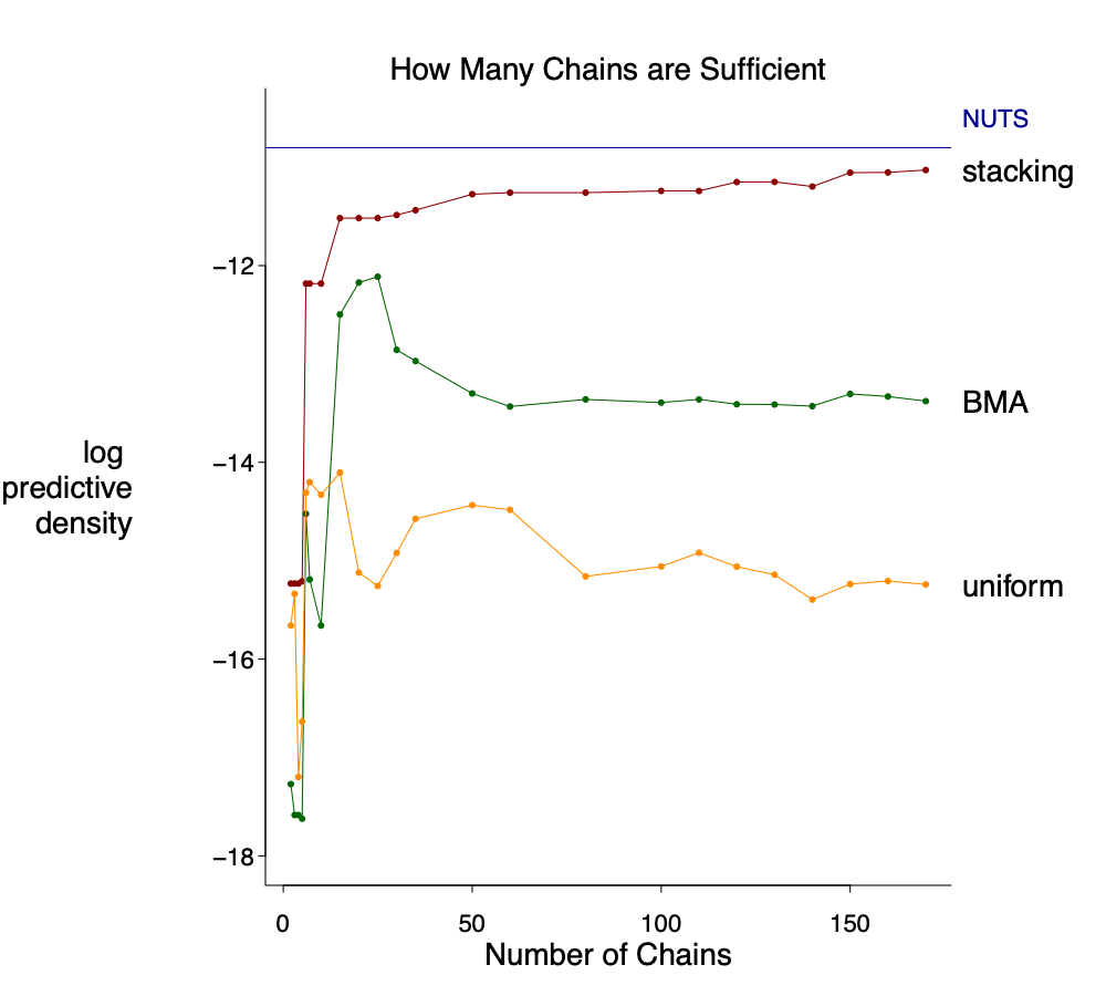 Just as in model averaging, we could also weight a chain $(\theta_{j,1},…, \theta_{j,s})$ by its elpd, which is asymptocially equvalent to Bayesian model avering, and we call it pesudo BMA weighting.