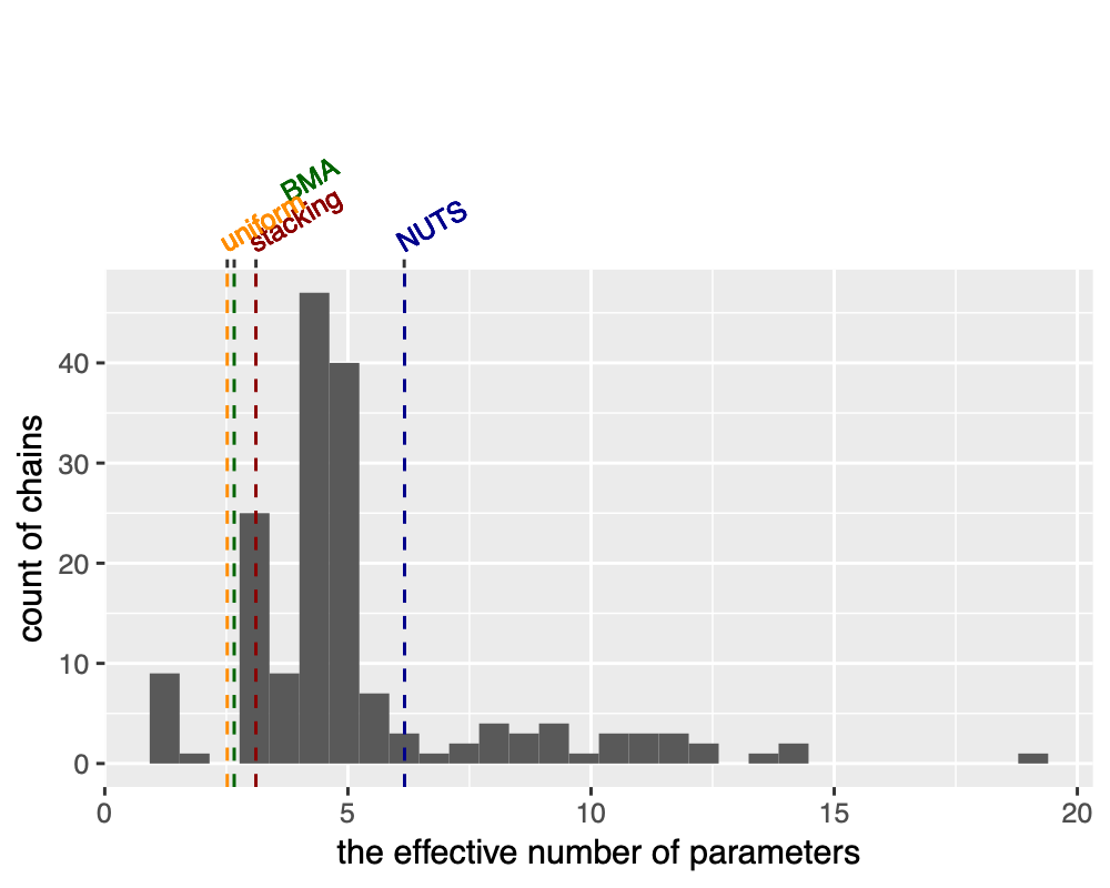 We should emphasize that computation uncertainty is part of the model, and some chains can significantly over fit. We measure that by the effective number of parameters: it varies from 1 to 20 in individual chains. The stacked one is about 3 (we compute by the same formula as the difference between loo-lpd and sample-lpd), slightly more expressive than uniform and BMA weighting, all of which are smaller than the effective number of parameters in NUTS as VI itself can be viewed as implicit regularization.