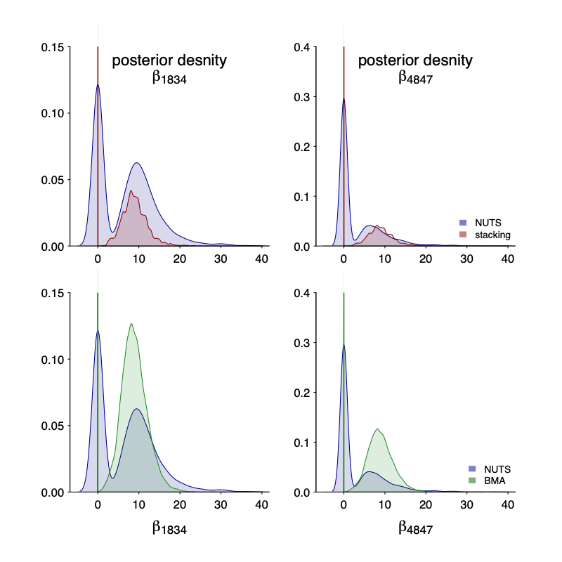 Unlike the previous example, here the horseshoe model itself is quite reasonable so it makes sense if the stacked VI distributions can approximate the exact HMC draws. It is not perfect match, but it does get the main point: a spike concentrated at 0 and a slab part– Depending on the purpose, a true spike in the stacked distribution might be even more appealing in terms of interpretation.