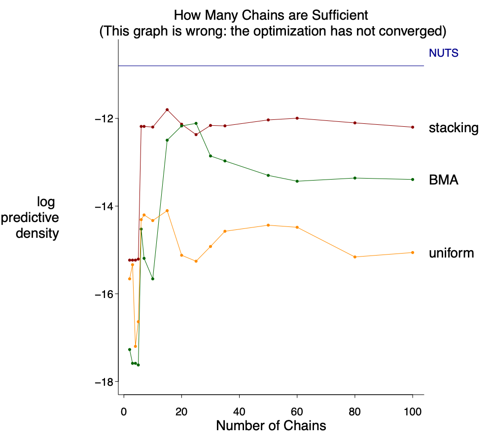 The correct graph is here. For stacking, there is a first jump at 5 chains, a second jump at 10 chains, and then almost stable afterwards. For pseudo-BMA a uniform weighting, the elpd is indeed worse when there are more chains.
